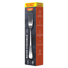 Комплектация – 6 столовых вилок. Тип вилок: столовые, Серия: STANDARD, Количество в комплекте: 6 шт., Толщина стали: 2 мм, Особенности ручки: металлическая, Стиль: классический, Материал: нержавеющая сталь, Длина: 205 мм, Цвет: серебристый, Упаковка: коробка. Код: 609078