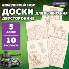 Набор досок для выжигания с рисунком BRAUBERG HOBBY подходит для выполнения работ по выжиганию или росписи красками. На каждую доску с двух сторон нанесен рисунок. Разнообразие дизайнов удовлетворит самого взыскательного творца.Товар предназначен для взрослых, увлекающихся творчеством, и детей старше 3 лет. В набор входят 5 досок толщиной 3 мм и размером А5. Сортность фанеры - 1/1 - отличается светлым тоном заготовок и почти полным отсутствием дефектов на поверхности. На каждую доску с двух сторон нанесены контурные детализированные изображения различных персонажей в стиле кубического мира.