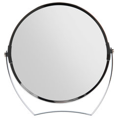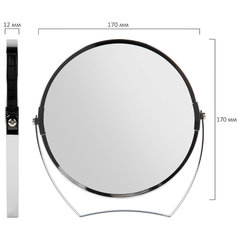 Тип размещения: настольное, Форма: круглая, Высота: 17 см, Ширина: 17 см, Двухстороннее: да, С увеличительным эффектом: да, Тип регулировки положения: нет, Вращающееся: да, Объем аккумулятора: без подсветки, Материал оправы: хромированная сталь, Цвет оправы*: серебристый, Цвет оправы: серебристый.