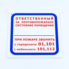 Комплект знаков "Ответственный за противопожарное состояние помещения" изготовлен в соответствии c ГОСТ, отраслевыми нормами, правилами и инструкциями.Знак "Ответственный за противопожарное состояние помещения" – это важный элемент системы пожарной безопасности. Он информирует об ответственном лице, которое следит за противопожарным состоянием помещения, и о телефонных номерах, по которым следует звонить в случае пожара.